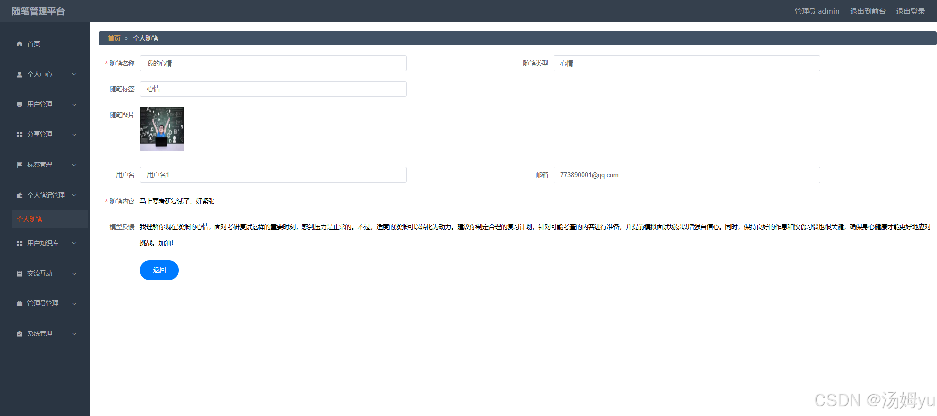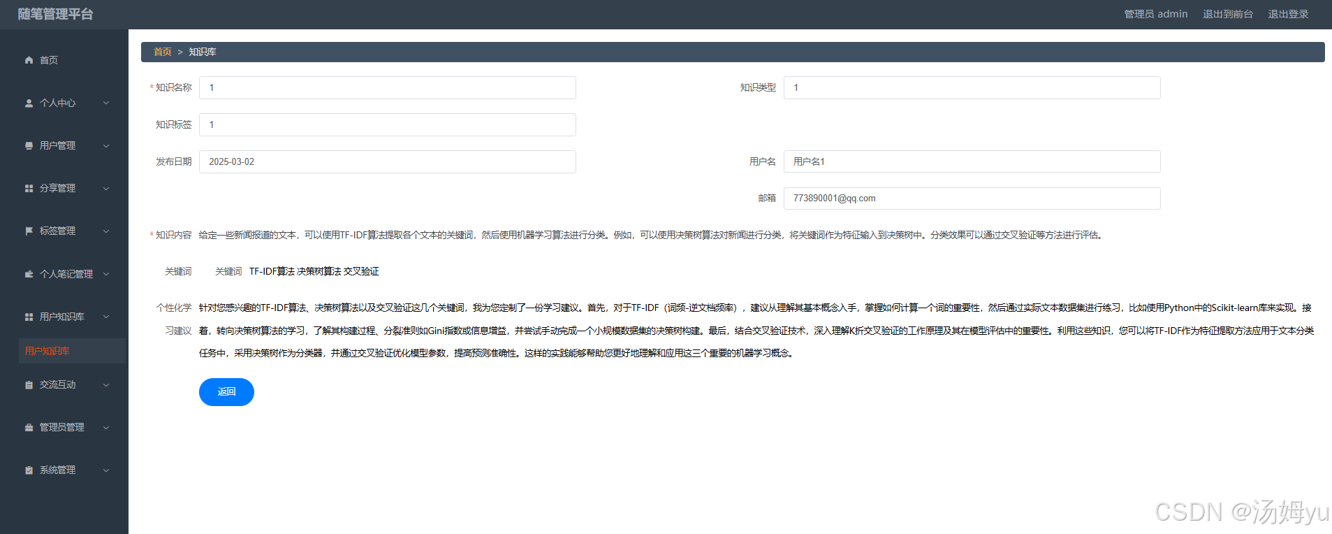 随手记系统记录了大量用户的经验、想法与创意。基于大模型技术,可对这些分散的信息进行整合与分析,挖掘潜在的知识关联,促进知识的共享与传播。不同用户之间的思想碰撞有助于激发创新灵感,推动各个领域的发展与进步。