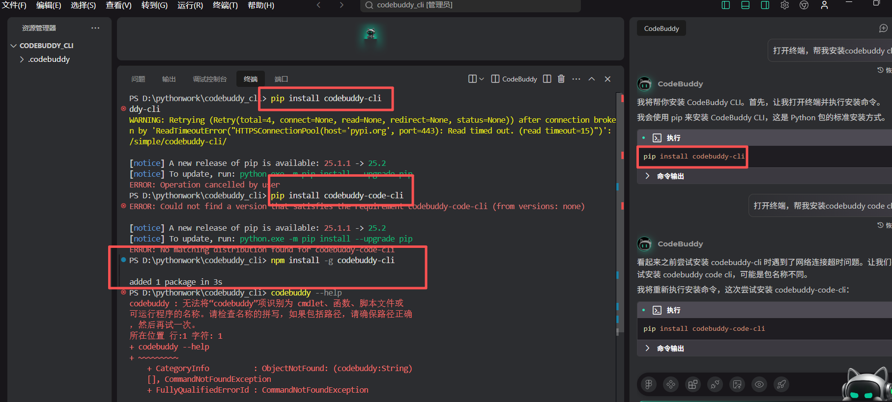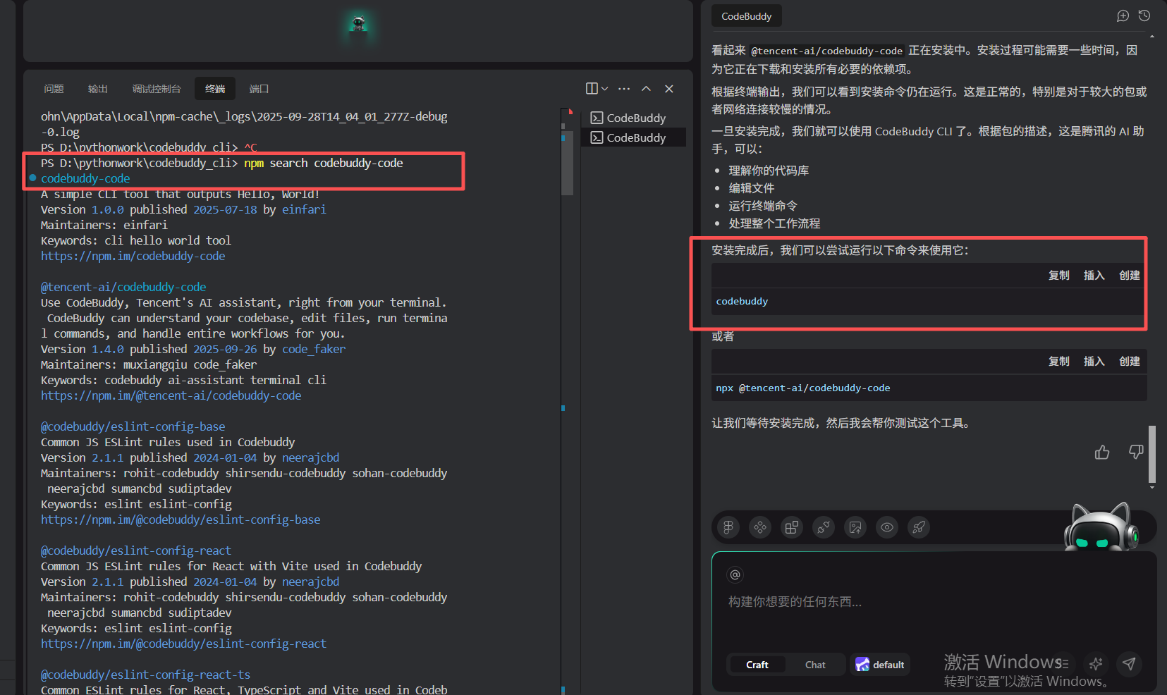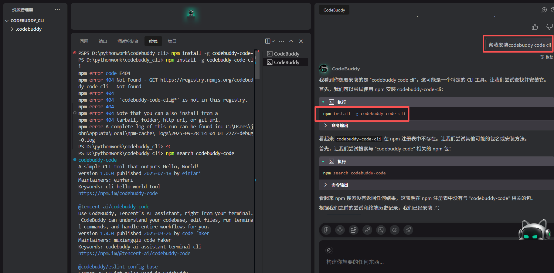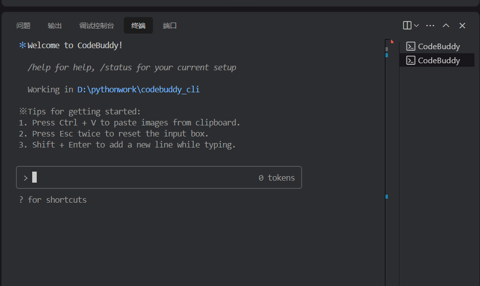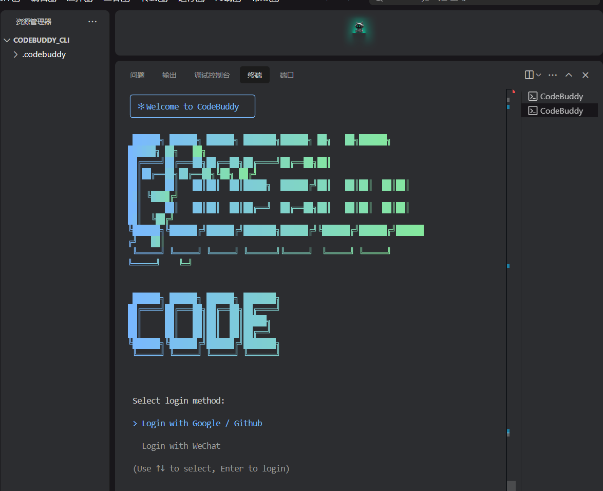 完成安装后在命令行窗口输入codebuddy即可启动运行。