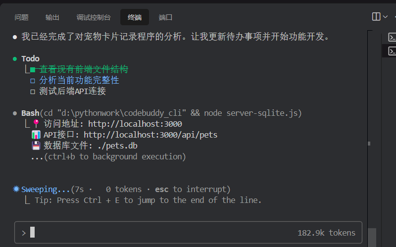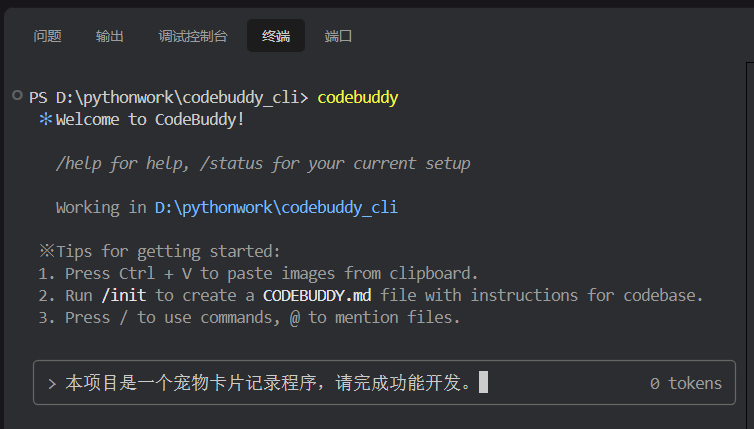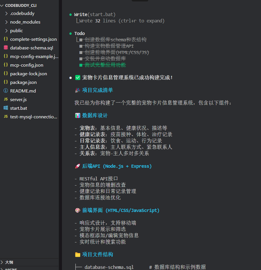 $ codebuddy "本项目是一个宠物卡片记录程序,请完成功能开发。"
