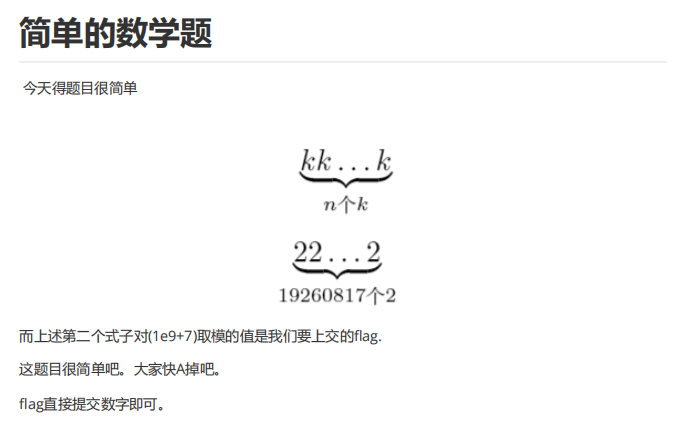 拿到一个pdf文件,上面有个数学题,前后看了一下有没有隐写,结果发现没有什么隐藏信息,看来确实是个数学题?有点奇怪为啥放在Misc这里,一般涉及数学的不应该放在Crypto中嘛。