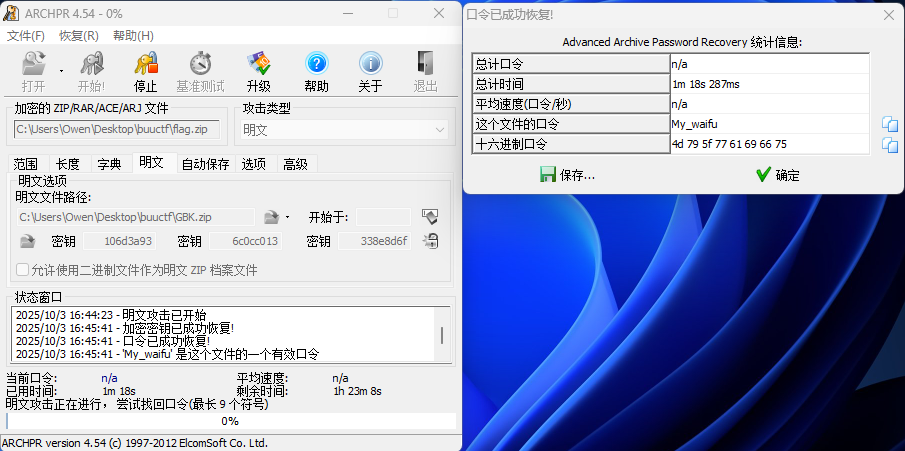准备好压缩文件后就可以用ARCHPR进行明文攻击了。配置如下,明文文件路径就是我们构造出的压缩文件路径,输出结果如图。