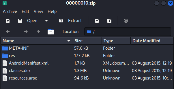 放进随波逐流工具后发现结尾有东西,但是分离出的文件看不懂是什么,应该是没有分离好。在kali中用foremost再进行一次分离。得到了一堆杂七杂八的文件,其中有个zip,看这个文件结构应该是个apk文件。