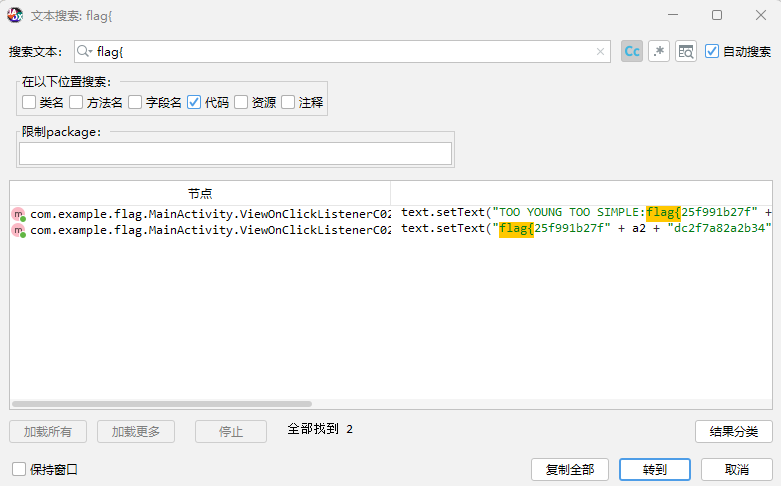 直接用jadx打开这个zip,jadx是个很好用的java反编译工具,项目地址(https://github.com/skylot/jadx)。打开后上方选择“工具” - “文本搜索”,搜索关键词“flag{”就可以得到flag的具体位置。