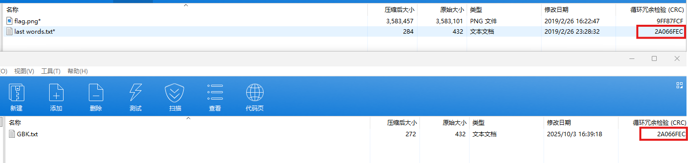 为了验证能否进行明文攻击,我们还需要检查两个压缩文件对应文本文件的CRC校验是否相同,只有相同的CRC校验码才能够进行明文攻击。如果不同,说明你用的压缩工具版本不对,或者写的Python程序存在问题。