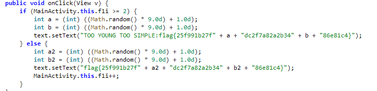 但是看到这里发现还没有结束,因为这三个段之间还有两个随机数。绝大多数的ctf比赛对答案的提交都是有次数限制的,所以一开始我以为这里还需要进一步判断,比如这里的random函数被固定了随机数种子等,但琢磨了半天没发现什么特殊的。前面题目内容提示要暴力破解,前面是字母后面是数字。这不是强制降低平台正确率嘛。这里我直接用了别的师傅的wp中的答案,其中也没看到暴力以外的方法,有方法的欢迎找我一起探讨。