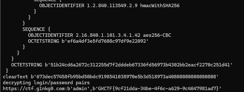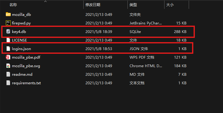 直接查看信息是看不到什么有用东西的,需要先进行解密。这样的工具GitHub上面不少,但都是直接读取本地路径的,想要做题就需要先伪造一个本地的密码路径有点麻烦,前后试了好几个,最后最方便的工具是这个项目(https://github.com/lclevy/firepwd)。下载好后把两个题目文件复制进去。