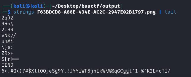 这是一张png图片,应该是用了某些隐写方法把口令隐写在了图片中。我们按照顺序进行图片分析,在使用strings打印可打印字符串时发现在IEND后面跟着的最后一行字符串的长度有点过长了。
