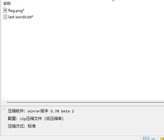 flag.zip也是一个加密压缩文件,并且检查后发现并不是伪加密。通过内容的“last word.txt”和注释中的压缩软件及压缩方式的标注,可以想到考点是明文攻击,前面我们遇到过类似的问题,我们不清楚图片的内容,只能通过前面的doc找出last words然后用同样的方式压缩进行明文攻击了。