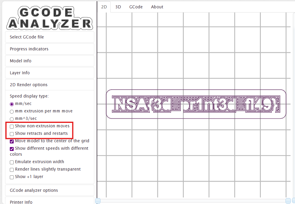 通过这个特征,还真的找到了一款名称为“G-code”的编程语言。网上有许多工具可以在线运行,这里我用的是(https://gcode.ws/)。首先需要把题目文件改为后缀为.gcode。然后上传这个平台,自动运行。下图红框中的选项不能勾选,否则出现的图案有遮挡。