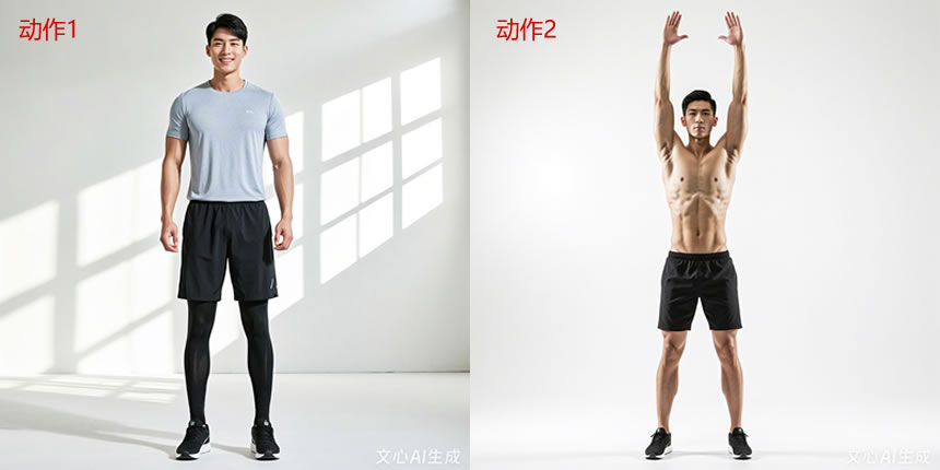如上图所示,这个运动主要为手部摆动动,包含2个分动作姿态,起始动作姿态1为双手垂放于左右两侧站立,结束动作姿态2双手举过头顶撑直为结束动作,完成动作2时计数加一,如此反复运动。