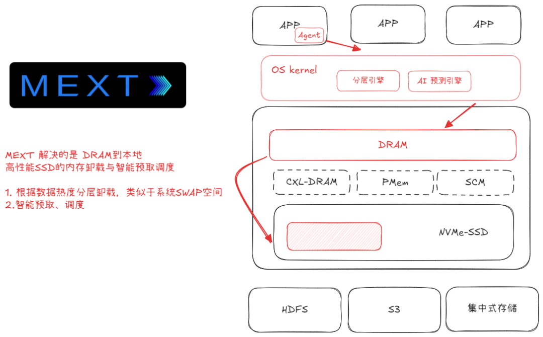 部署位置与透明性 MEXT 是一个纯软件解决方案,安装在单个物理机或虚拟机节点上。它的集成发生在操作系统底层,对上层的操作系统和应用程序完全透明,无需对现有应用进行任何代码修改或重新编译 2。核心组件 MEXT 的系统架构主要由三个紧密协作的模块构成:监控模块(Monitoring Module) :这是一个轻量级的遥测内核模块(telemetry kernel module)。它的职责是持续不断地监控内存页的访问模式,通过追踪访问频率、时间间隔等指标,实时地识别出哪些页面是“热”的(被频繁访问),哪些已经变“冷”(长时间未被访问)2。分层引擎(Tiering Engine) :该引擎负责执行实际的数据移动操作。当监控模块识别出冷页面后,分层引擎会将其从宝贵的 DRAM 中“卸载”(offload)到一个预先配置好的、容量更大的高速 NVMe 闪存分区中 2。AI 预测引擎(AI Prediction Engine) :这是 MEXT 的核心知识产权所在。该引擎接收监控模块提供的实时访问模式数据,并利用其内置的 AI 模型进行分析和预测。它的目标是预测出那些刚被卸载到闪存中的页面中,有哪些很可能在不久的将来被应用程序再次请求。一旦预测命中,它会抢在应用程序产生缺页中断(page fault)之前,主动地、透明地将这些页面从闪存预取回 DRAM 1。工作机制 从操作系统的视角来看,安装 MEXT 后,系统的总可用内存表现为 DRAM 容量与 MEXT 管理的闪存分区容量之和 7。当应用程序发起一个内存访问请求时,理想情况是 MEXT 的 AI 引擎已经成功预测到了这次访问,并提前将对应的内存页加载到了 DRAM 中。此时,访问请求会直接在 DRAM 中命中,获得纳秒级的响应速度。如果发生预测失败或首次访问(冷启动),应用程序会触发一个缺页中断,此时 MEXT 系统会从闪存中读取页面到 DRAM,这个过程会带来微秒级的延迟,但避免了更慢的磁盘 I/O 1。MEXT 的性能表现,本质上取决于其 AI 预测引擎的命中率。02