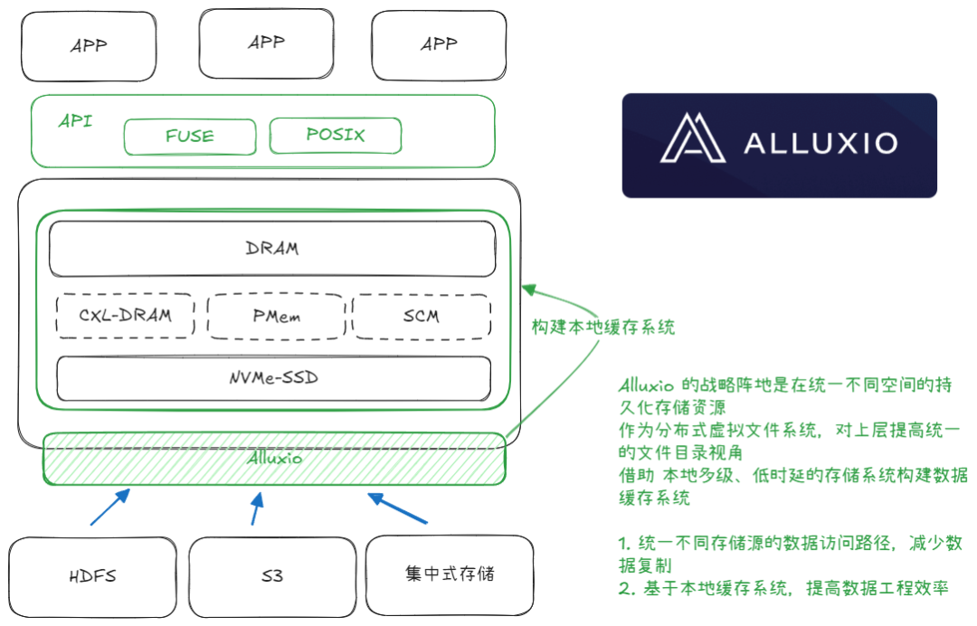 核心问题 :分离式架构的 I/O 鸿沟现代数据平台的架构趋势是计算与存储的分离。计算集群(如运行在 Kubernetes 或虚拟机上的 Spark、Presto)与存储系统(如云对象存储 S3、HDFS)被独立部署和扩展 22。这种分离带来了极大的弹性和成本效益,但也引入了新的性能瓶颈:网络延迟和存储吞吐量限制。当计算节点需要访问远程数据时,I/O 成为瓶颈,导致昂贵的计算资源(CPU 和 GPU)长时间处于空闲等待状态,利用率低下 24。Alluxio 的创始使命 :数据访问的“最后一公里”Alluxio 的前身是诞生于加州大学伯克利分校 AMPLab(Spark 的发源地)的“Tachyon”项目,其最初目标就是解决大数据生态系统内部的数据共享和数据局部性问题 26。随着技术发展,其使命演变为“弥合任意计算框架与任意存储系统之间的数据访问鸿沟” 22。技术挑战 :统一与加速面临的挑战是,如何在不进行大规模数据迁移、不修改上层应用代码的前提下,为应用程序提供一个统一且高性能的数据视图,而这些数据实际上物理分散在异构、远程的多个存储系统中 22。Alluxio 的解决之道 :虚拟的分布式缓存层Alluxio 的架构理念是充当一个“虚拟分布式文件系统”(Virtual Distributed File System)或数据编排层,位于计算和存储之间 23。它通过两大核心机制解决上述挑战:统一命名空间(Unified Namespace) :Alluxio 提供一个逻辑上的、全局统一的文件系统视图,将底层的多个不同存储系统(如 S3、HDFS、Azure Blob Storage)挂载(mount)到其命名空间下的不同目录。上层应用只需与 Alluxio 交互,无需关心数据究竟存储在哪里。智能分布式缓存(Distributed Caching) :当应用首次读取数据时,Alluxio 会从底层存储系统(Under File System, UFS)中拉取数据,并将其以数据块的形式缓存在靠近计算节点的存储介质上(如 DRAM、NVMe SSD)。后续对相同数据的访问将直接由 Alluxio 的缓存提供服务,速度可达本地内存或网络传输的级别,从而绕过了远程存储的 I/O 瓶颈 23。这三种技术的发展轨迹清晰地反映了数据基础设施问题的演进。首先,云计算的普及推动了计算与存储的分离,这带来了数据局部性和 I/O 性能问题,Alluxio 应运而生,解决了这一基础性问题 。其次,在数据访问被加速后,应用(特别是 AI/ML)本身变得越来越庞大和复杂,它们在内存中持有大量状态并长时间运行,这又带来了应用自身的脆弱性、容错能力以及对昂贵加速器(GPU)的高效管理问题,MemVerge 的出现正是为了解决这一系列应用层面的挑战 。最后,当这些应用对单个节点的内存需求不断膨胀时,DRAM 本身的成本成为了主要的经济瓶颈,MEXT 则针对性地解决了这一硬件层面的成本优化问题 。因此,架构师在进行技术选型时,与其说是进行技术偏好选择,不如说是对其技术栈核心痛点的一次精准诊断:问题的根源究竟是 I/O 延迟、应用弹性,还是内存成本?这个框架为后续的深入分析提供了强有力的视角。