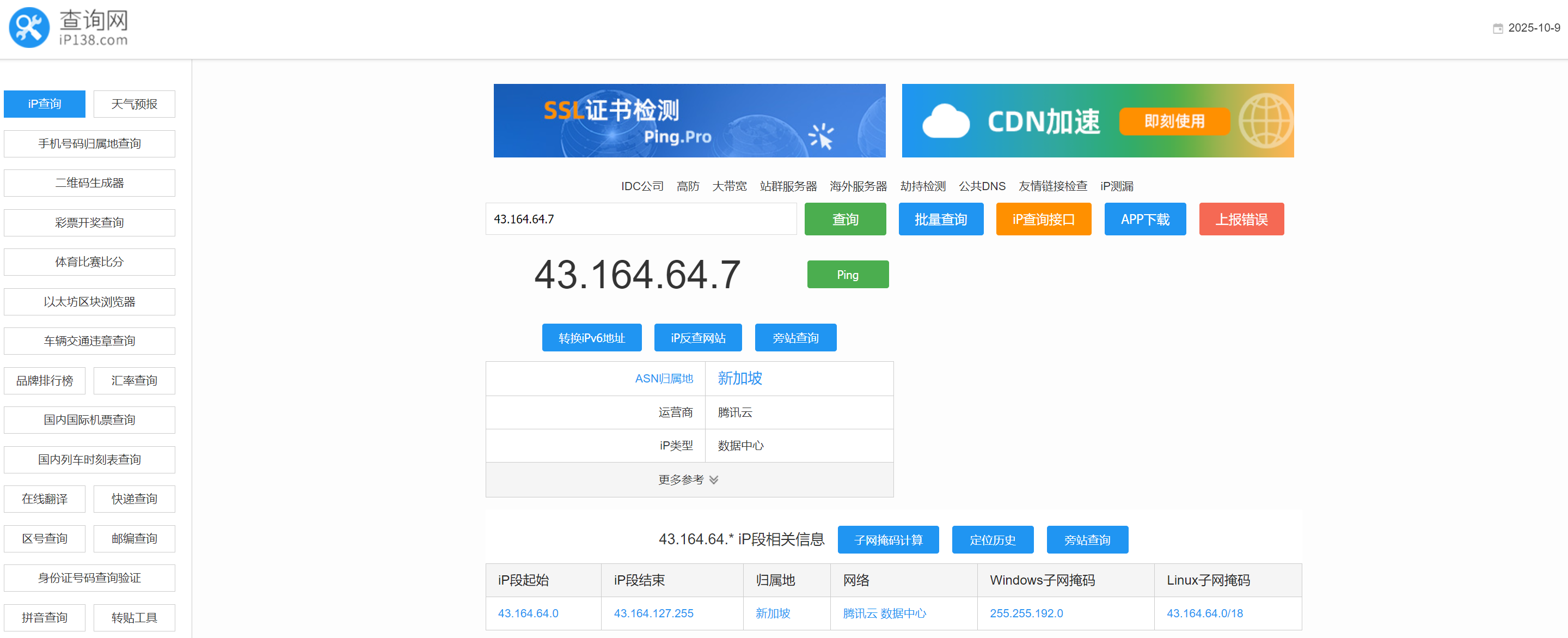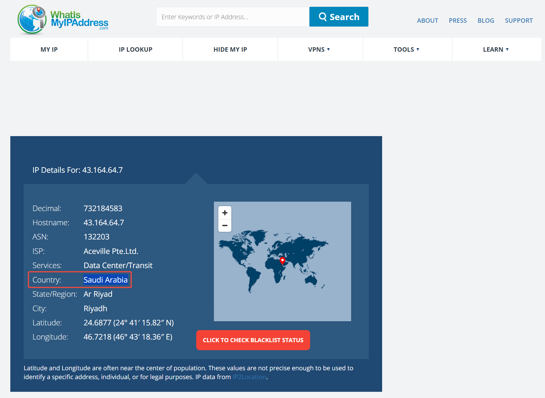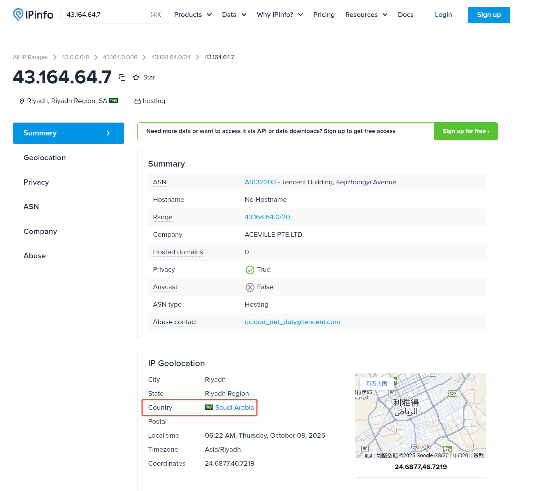 上面3个站点查得43.164.64.7归属地是沙特阿拉伯(Saudi Arabia),而ip138查到是新加坡