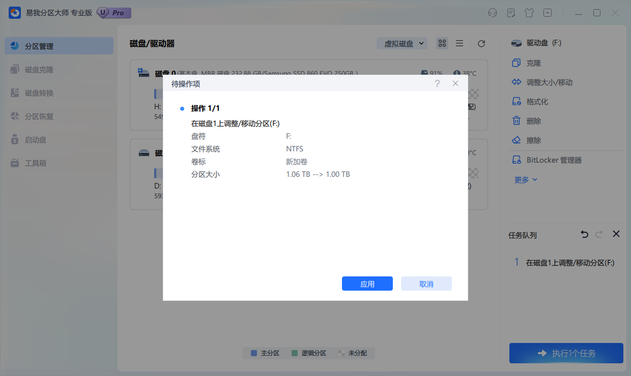 确定要执行操作时,点击软件右下角【执行1个任务】,然后选择【应用】以执行该项操作。