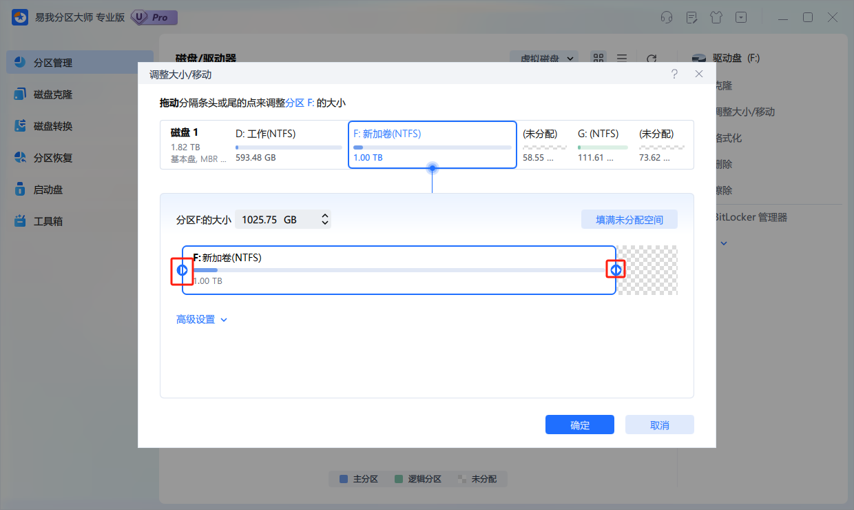 在弹出的【调整大小/移动】的窗口中,拖动分区两侧的分隔条,或通过高级设置“分区大小”、“分区前方可用空间”和“分区后方可用空间”,以调整分区大小或移动其位置。设置完成之后,点击【确定】