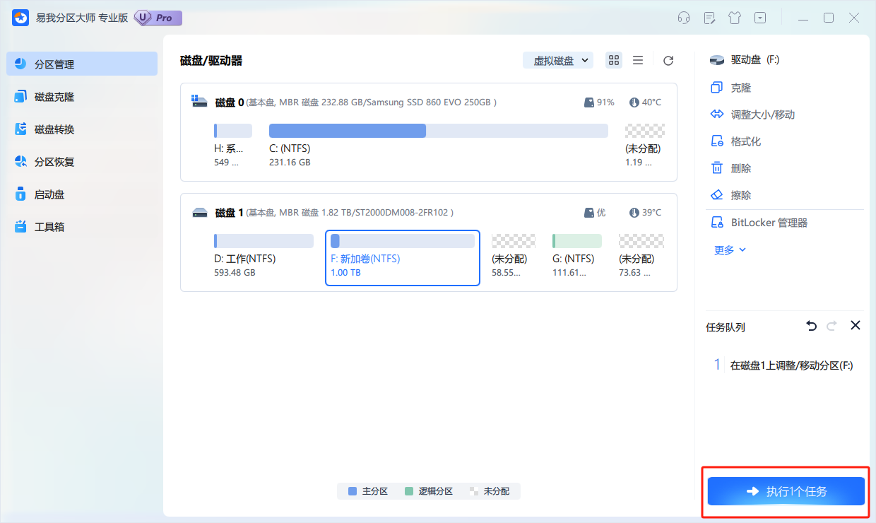 打开易我分区大师(EaseUS Partition Master Professional),在首页选中需要调整大小或移动位置的分区(如F盘),在右侧功能列表中选择【调整大小/移动】。