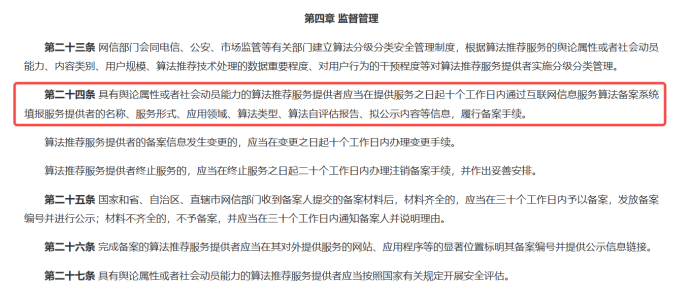 根据《互联网信息服务算法推荐管理规定》第二十四条,具有舆论属性或者社会动员能力的算法推荐服务提供者应当在提供服务之日起十个工作日内通过互联网信息服务算法备案系统填报服务提供者名称、服务形式、应用领域、算法类型、算法自评估报告、拟公示内容等信息,履行备案手续。