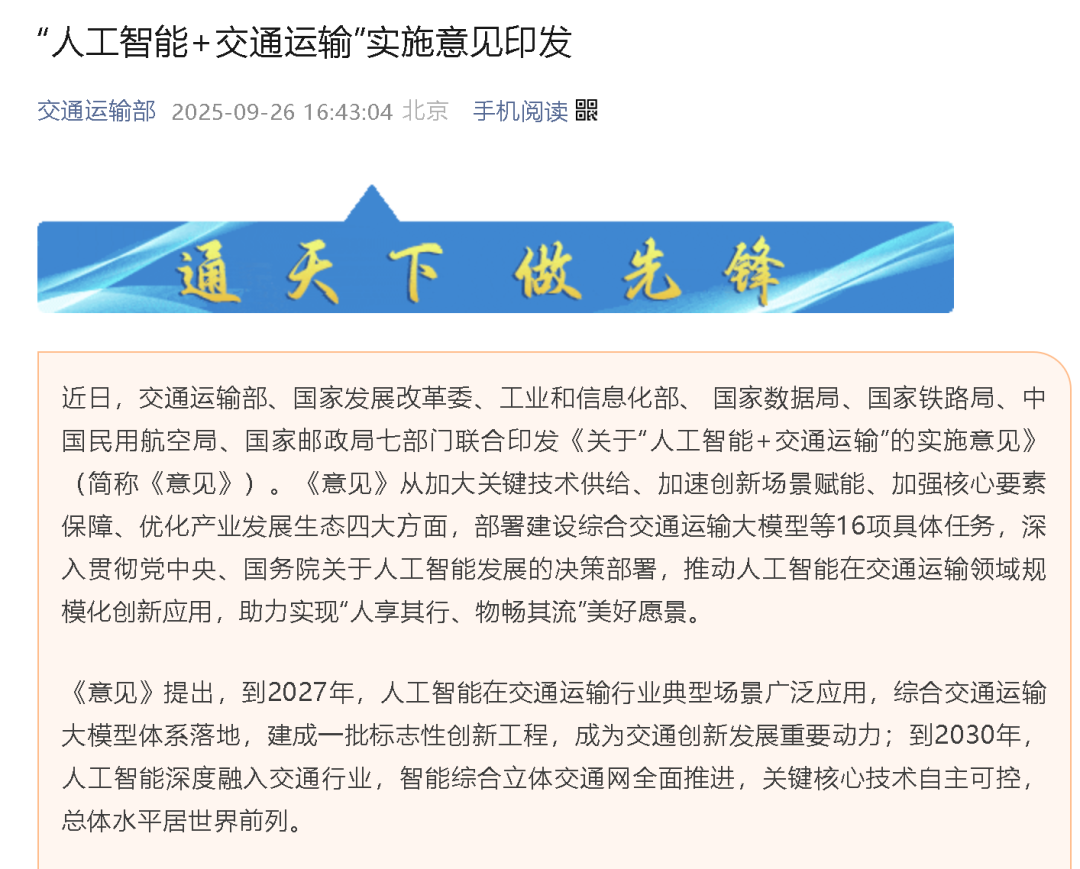 为了全面落实《交通强国建设纲要》《国家综合立体交通网规划纲要》和《国务院关于深入实施“人工智能+”行动的意见》,加快推动人工智能在交通运输领域规模化创新应用,七部门联合印发《关于“人工智能+交通运输”的实施意见》。