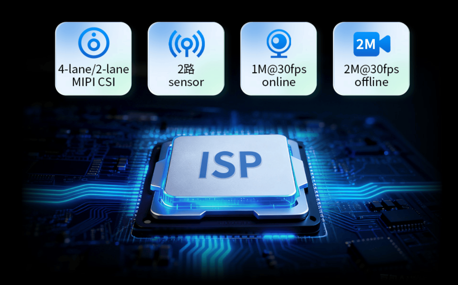 T153支持4-lane/2-lane MlPl-CSl,集成的ISP最大支持2路sensor,处理能力可达1M@30fps online、2M@30fps offline。