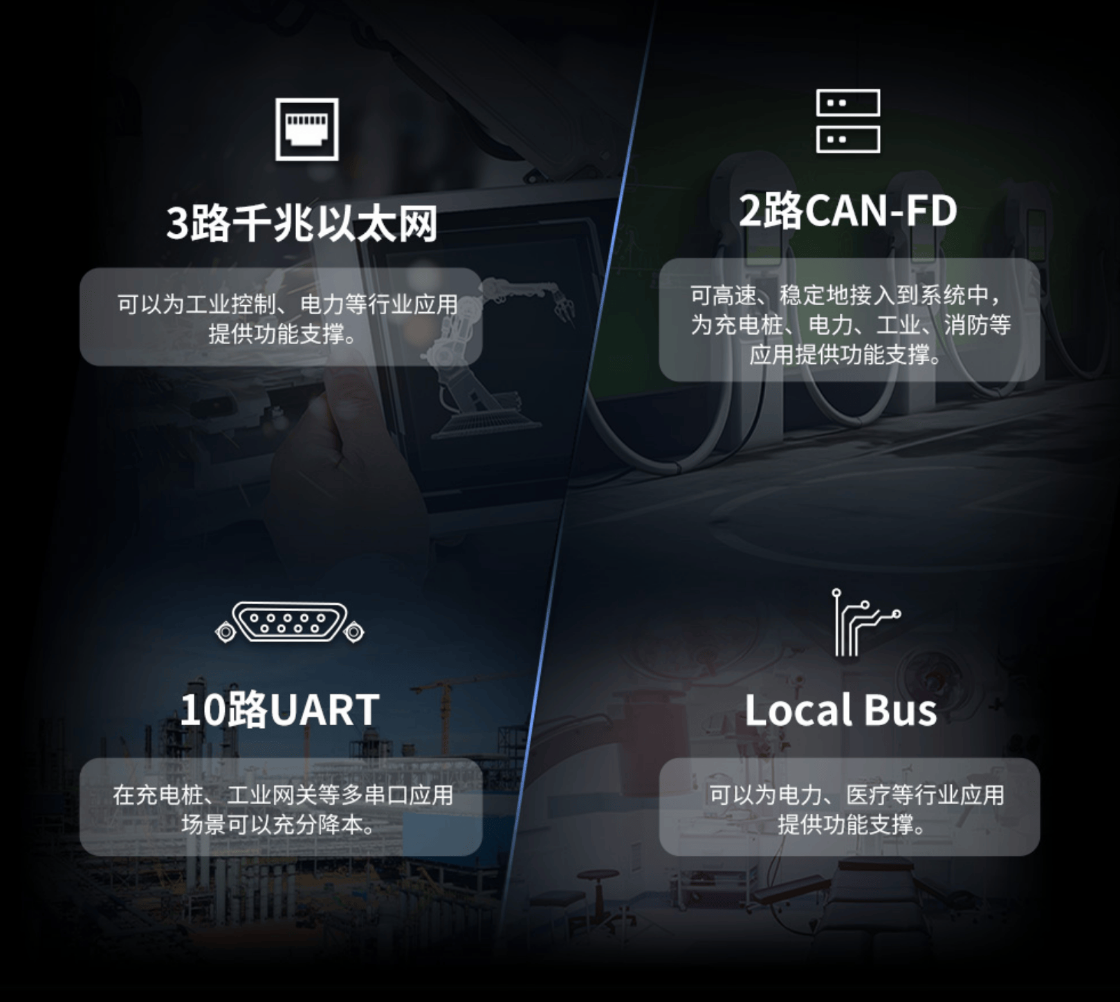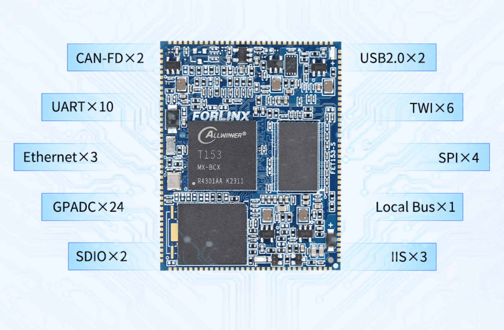 飞凌嵌入式FET153-S核心板配备3路千兆以太网接口、2路CAN-FD接口和Local Bus,支持高吞吐量网络连接,满足复杂数据驱动型应用需求。此外,T153处理器还提供10路UART、24路GPADC、6路TWI接口、30路PWM等接口,这些接口为多样化应用提供灵活性。