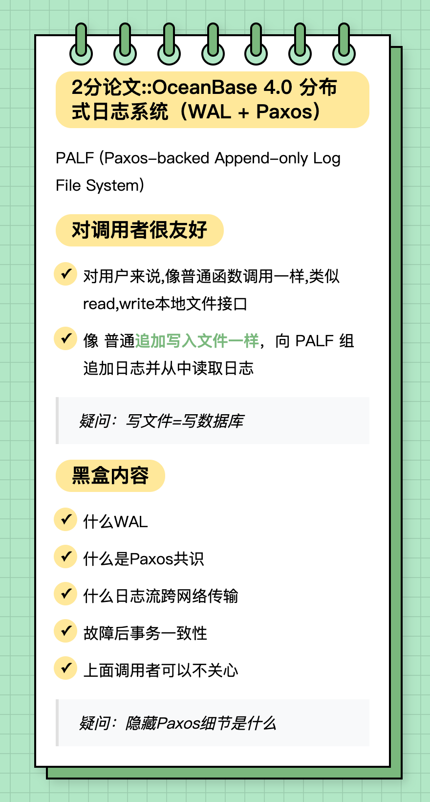 📌 核心 WAL :先写日志再写数据 → 确保数据安全PALF :在 WAL 基础上 + Paxos 共识 → 让日志变得更可靠、更高效本文深入解读 该篇论文中所阐述的 OceanBase 4.0 分布式日志系统 PALF(Paxos-backed Append-only Log File System)的架构设计和突出优势。 PALF 基于 Paxos 算法设计并实现了分布式共识协议, 使 OceanBase 数据库能有效容忍运行过程中的机器故障等异常,原生支持数据库级高可用方案,同时高效搭载 分布式数据库事务引擎,支撑 OceanBase 提供极致的性能表现
