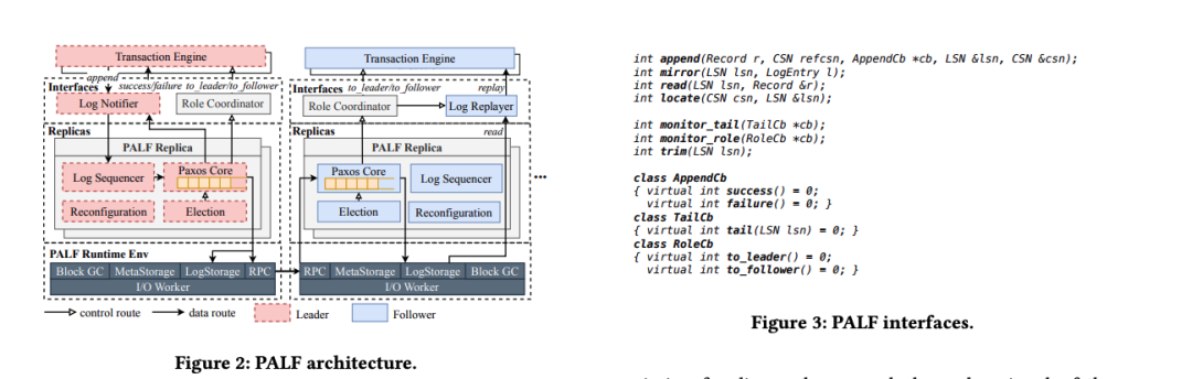 the interface layer, the PALFreplicas layer, and the PALF runtime environment. The lower twolayers take charge of log replication, reconfiguration, and log storage;