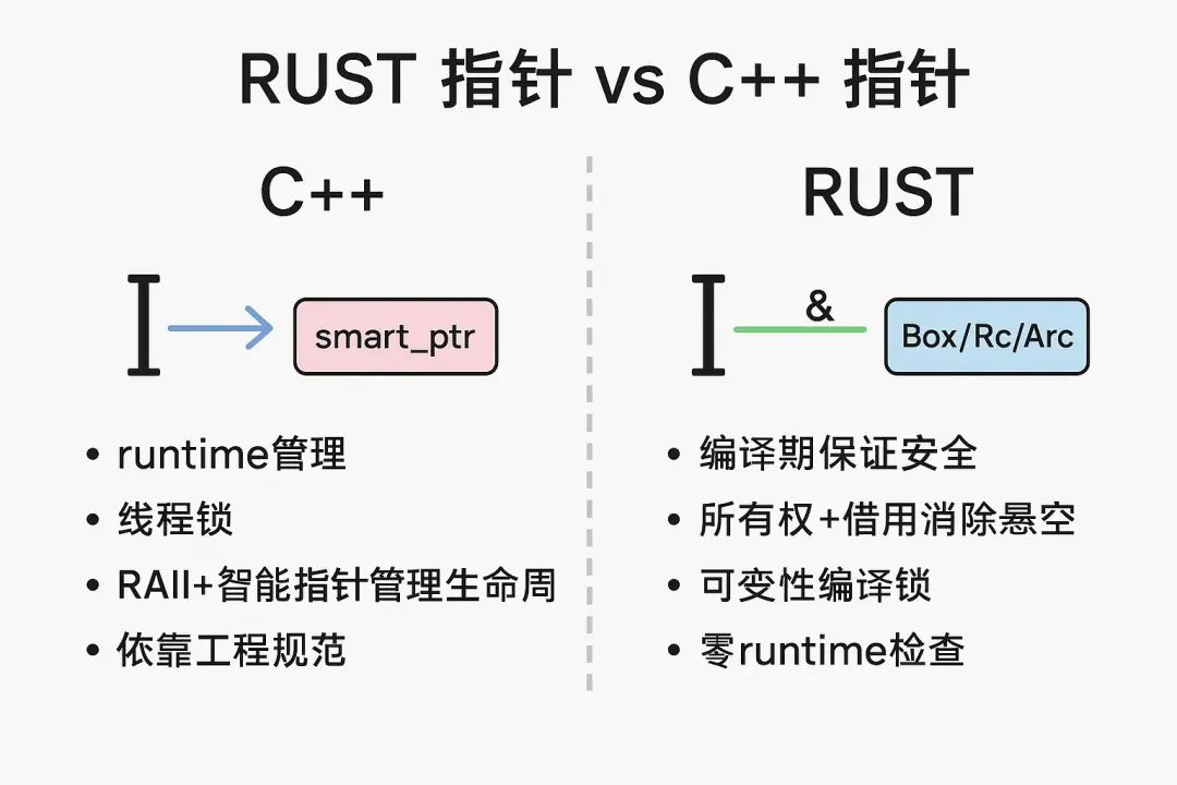 可变性控制 | 指针指向可变或不可变对象 | 与原对象一致 | 可借用(不可变)或可变借用,编译器保证互斥 |