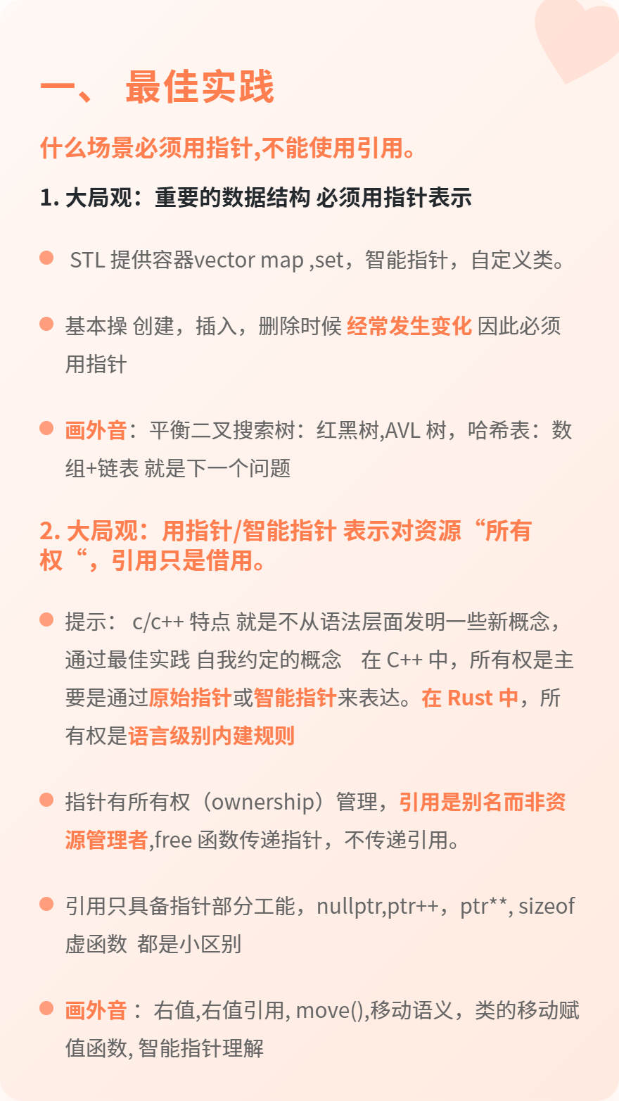 我并没有新增 c++语法知识,深入 引用是变量别名 扩展到变量所有权管理,这个很大话题 指针=拥有权,需要管理生命周期;引用=别名,不管理生命周期