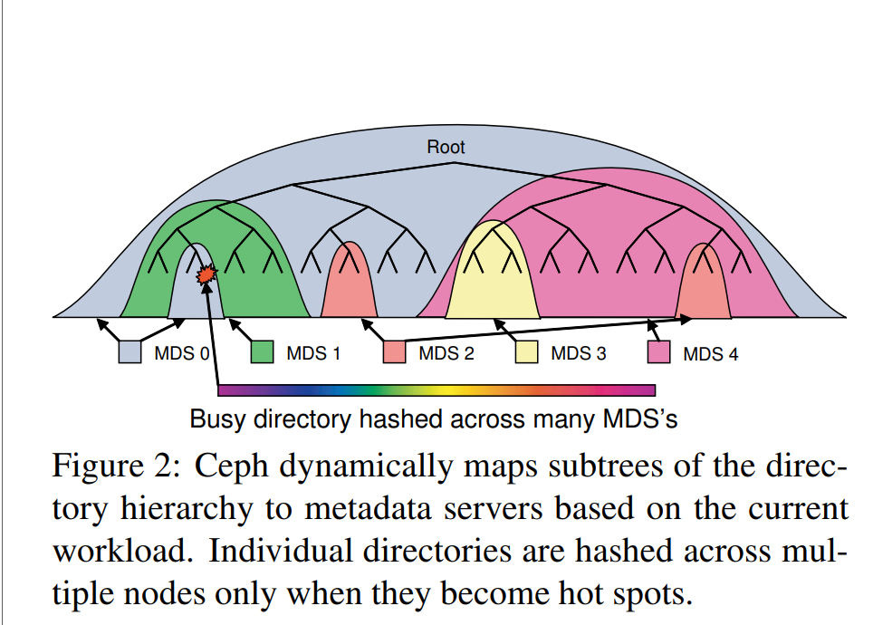 动态子树分区:目录树被切成多个子树,每个子树只由一个 MDS 管理。MDS 会监控访问热度,负载不均时可把子树迁移给其他 MDS。