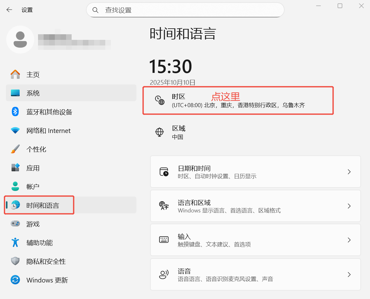①Windows徽标上右键→ 设置→ 时间和语言→ 时区