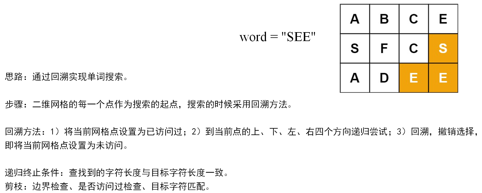 通过回溯实现单词搜索。步骤:二维网格的每一个点作为搜索的起点,搜索的时候采用回溯方法。1)将当前网格点设置为已访问过;2)到当前点的上、下、左、右四个方向递归尝试;3)回溯,撤销选择,即将当前网格点设置为未访问。