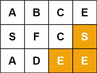 输入:board = [["A","B","C","E"],["S","F","C","S"],["A","D","E","E"]], word = "SEE"