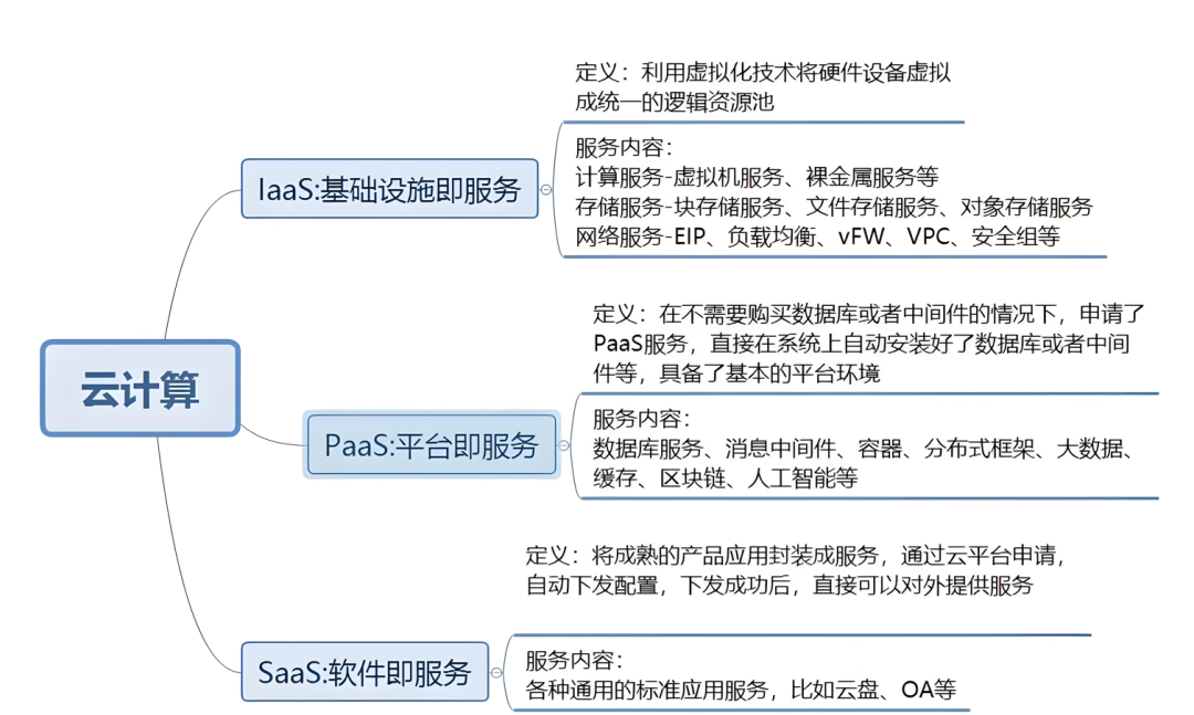 服务模式根据 “云服务商与用户的责任边界” 划分,核心是 “分层交付资源”,需先明确云计算的三层架构: