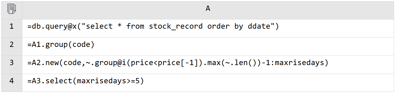 面对前述的股票连涨分析需求,用 SPL 实现变得直观而简单: