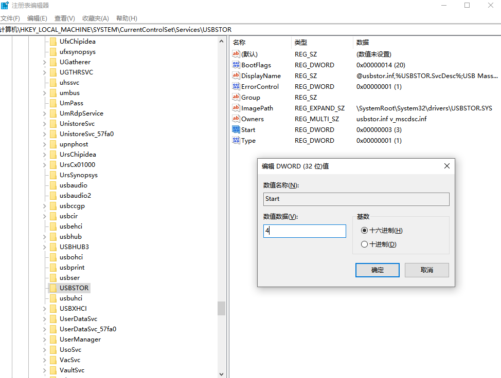将其数值数据改为 4,点击“确定”。(数值4表示禁用USB存储设备)