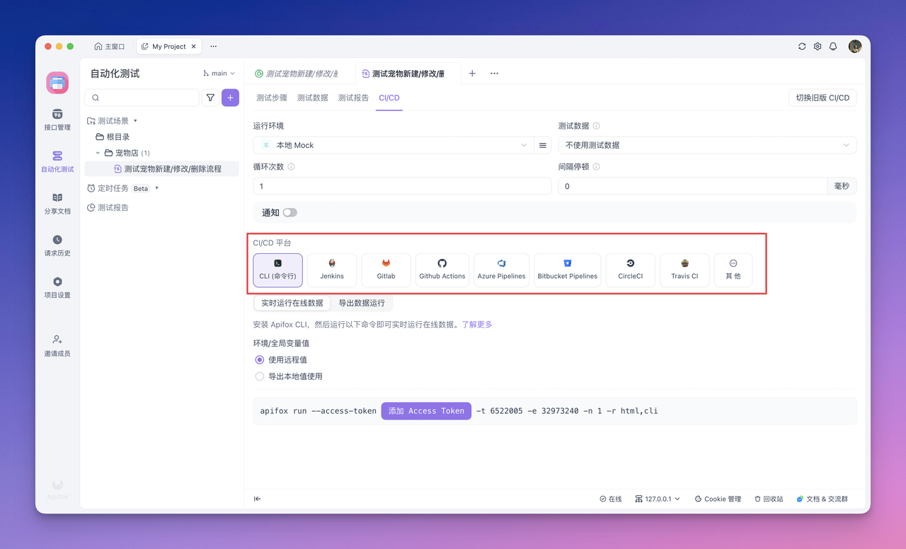 Apifox:提供功能强大且易于使用的 CLI 工具,可深度集成主流 CI/CD 平台,如 Jenkins、GitLab CI、GitHub Actions、Azure DevOps 等。同时配备详细文档,支持在流水线中自动化执行 API 测试、文档生成、Mock 服务部署等操作。
