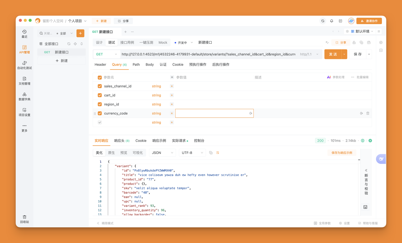 Apifox | 智能化变量管理:支持参数化、环境变量、全局变量、动态变量,并提供强大的前/后置脚本(JavaScript),内置丰富模块。可视化变量提取功能,通过简单的点选即可完成响应内容提取,大幅降低了非开发人员的使用门槛,支持更复杂的业务逻辑编排。 |