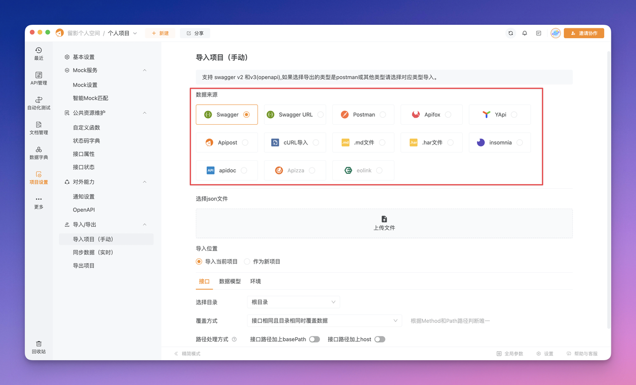 Apipost:也支持主流格式(如 Postman、Swagger)的导入导出功能,可满足大多数开发调试需求,但在边缘格式、版本兼容性等方面尚有提升空间。
