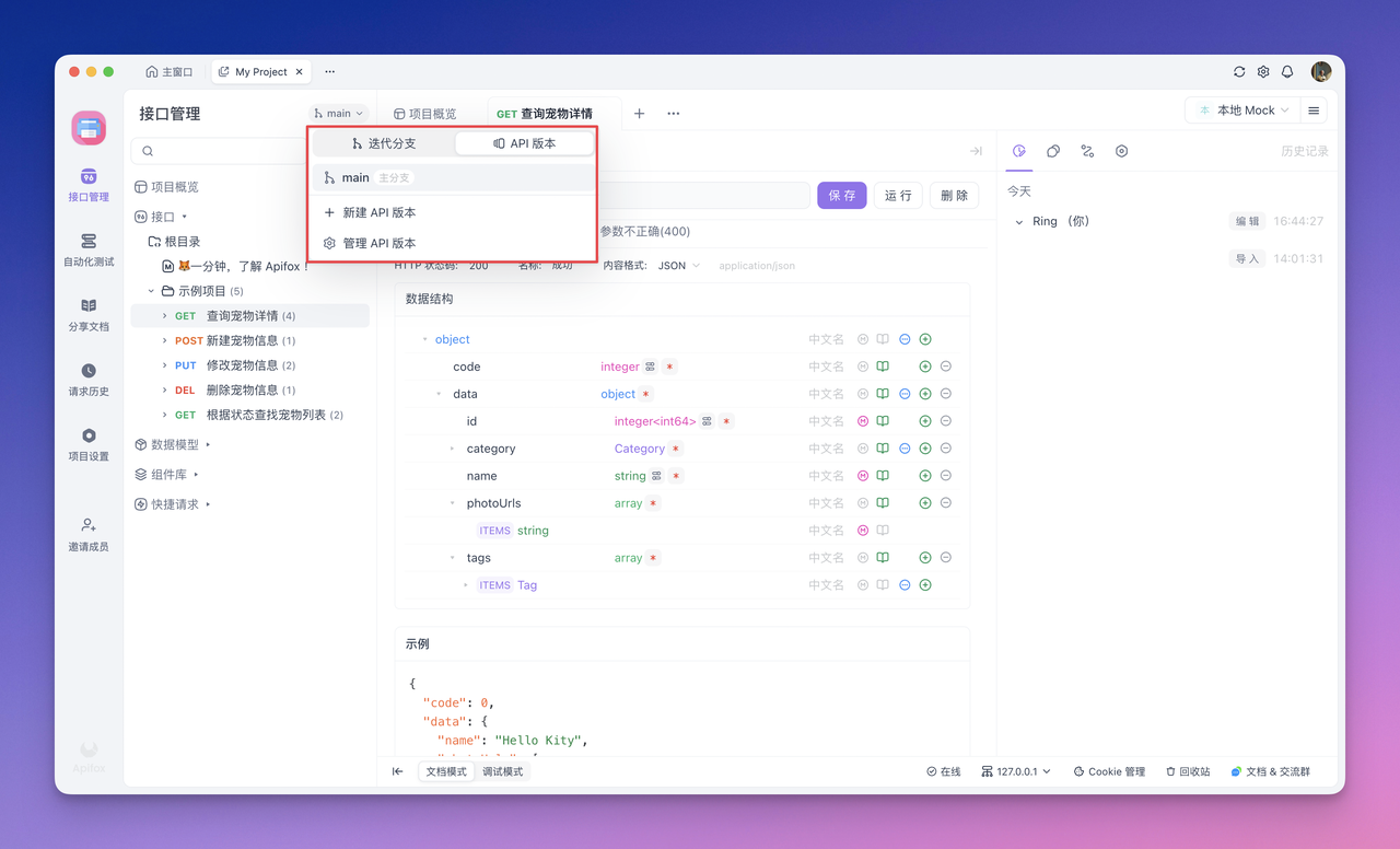 Apipost:目前仅支持单个接口内的历史记录,不支持 API 版本管理功能,因此在多版本 API 设计和管理上存在局限,也没有分支功能。