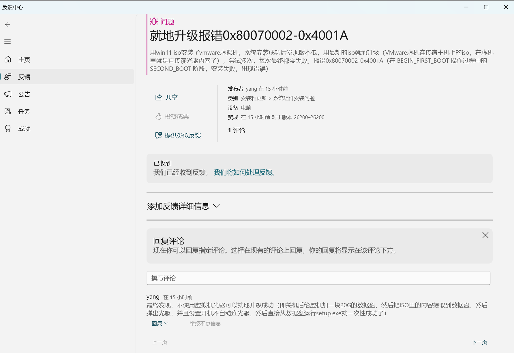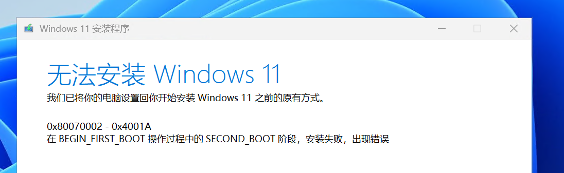 用win11 iso安装了vmware虚拟机,系统安装成功后发现版本低,用最新的iso就地升级(VMware虚机连接宿主机上的iso,在虚机里就是直接读光驱内容了),尝试多次,每次最终都会失败,报错0x80070002-0x4001A(在 BEGIN_FIRST_BOOT 操作过程中的 SECOND_BOOT 阶段,安装失败,出现错误)