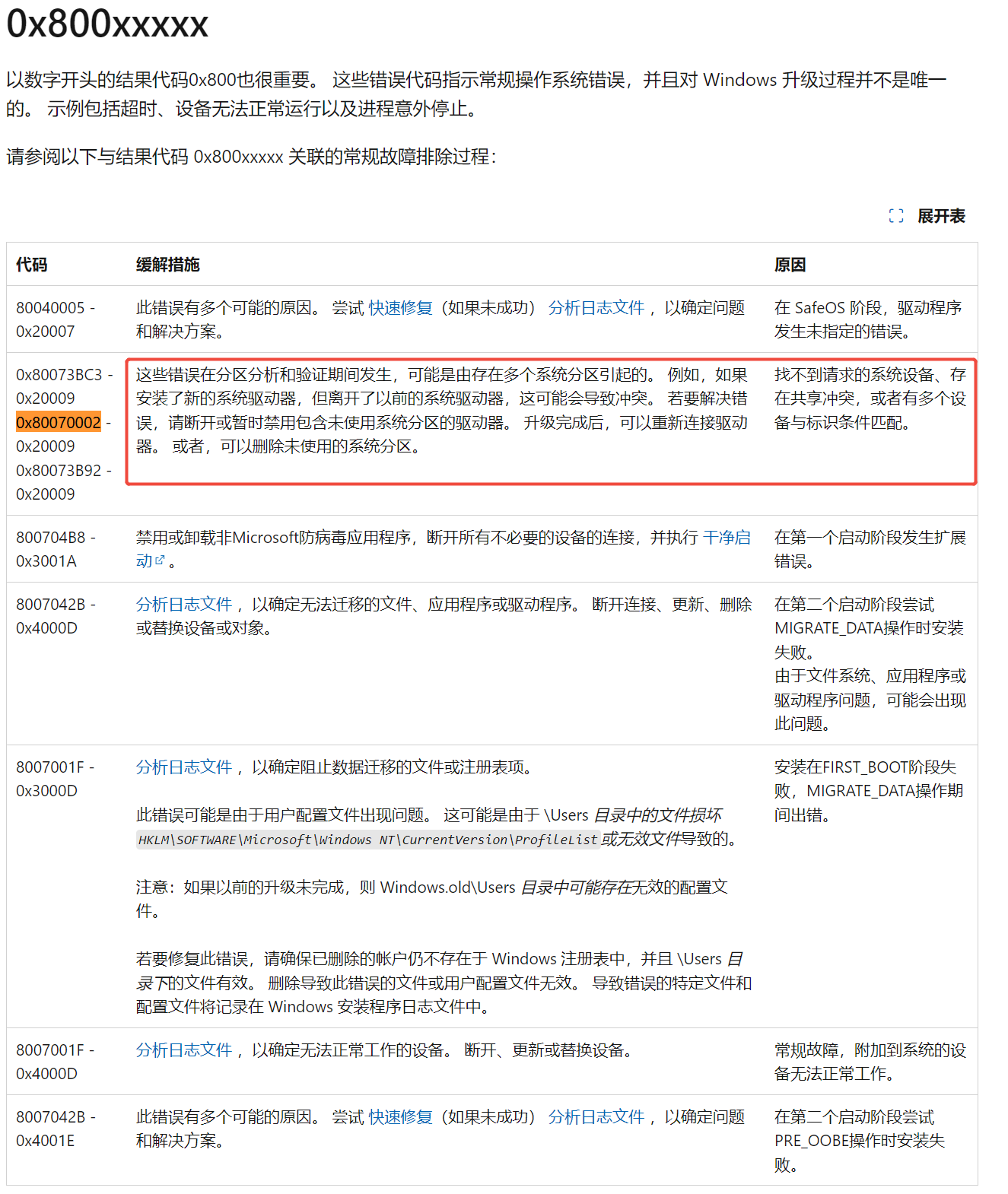 https://learn.microsoft.com/zh-cn/troubleshoot/windows-client/setup-upgrade-and-drivers/windows-10-upgrade-resolution-procedures?toc=%2Fwindows%2Fdeployment%2Ftoc.json&bc=%2Fwindows%2Fdeployment%2Fbreadcrumb%2Ftoc.json#other-error-codes