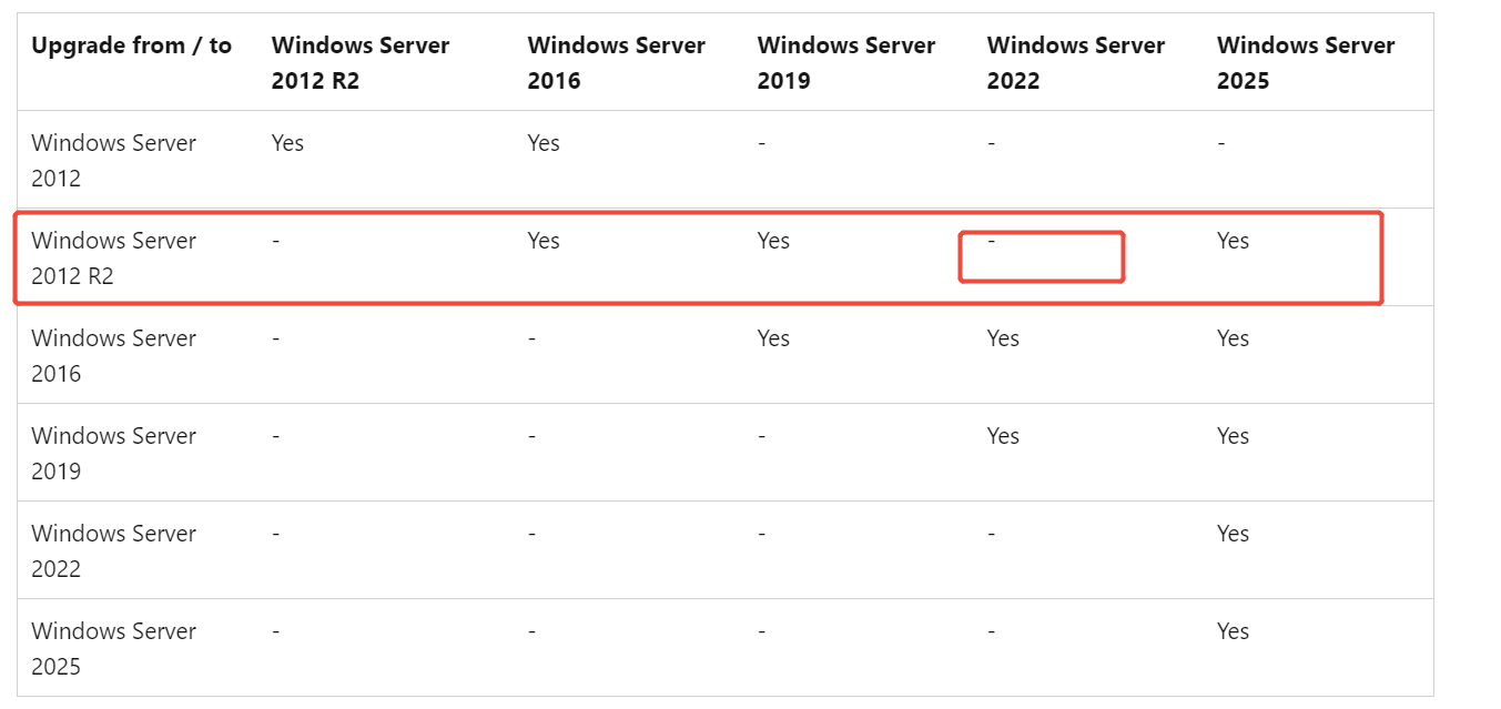 Server2012R2可以就地升级到2016、2019、2025,但不能到2022,好奇怪,待实测验证