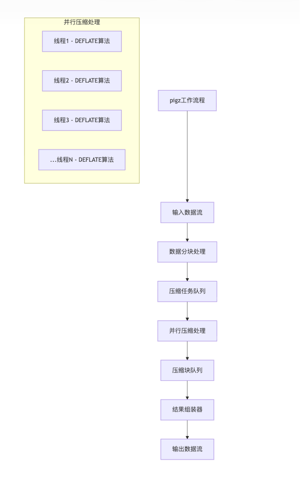 pigz的核心思想是将压缩任务分解成多个独立的块,然后在不同的处理器核心上并行处理这些块。其工作流程如下: