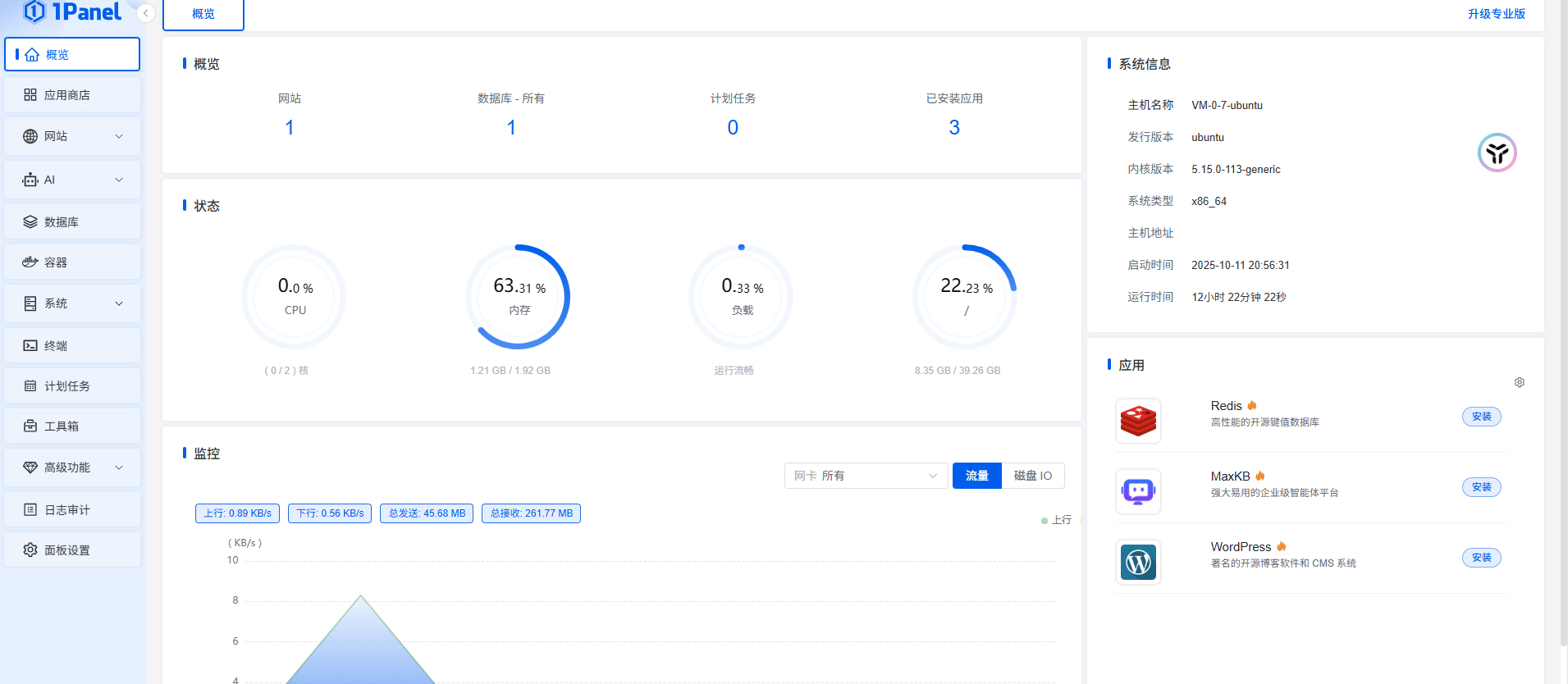 这里面就进入了1Panel控制面板,这里1Panel就相当于是一个服务的后端。