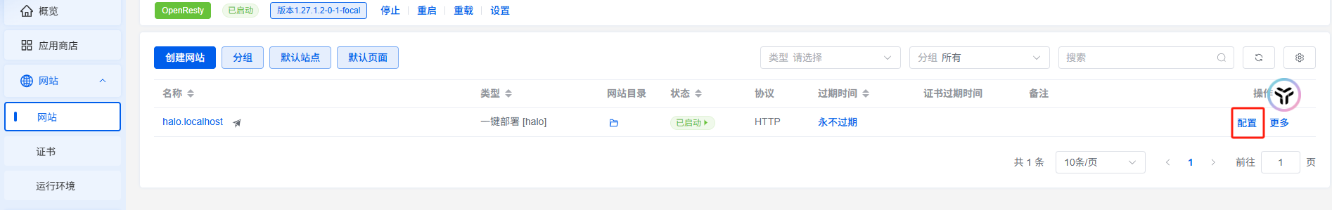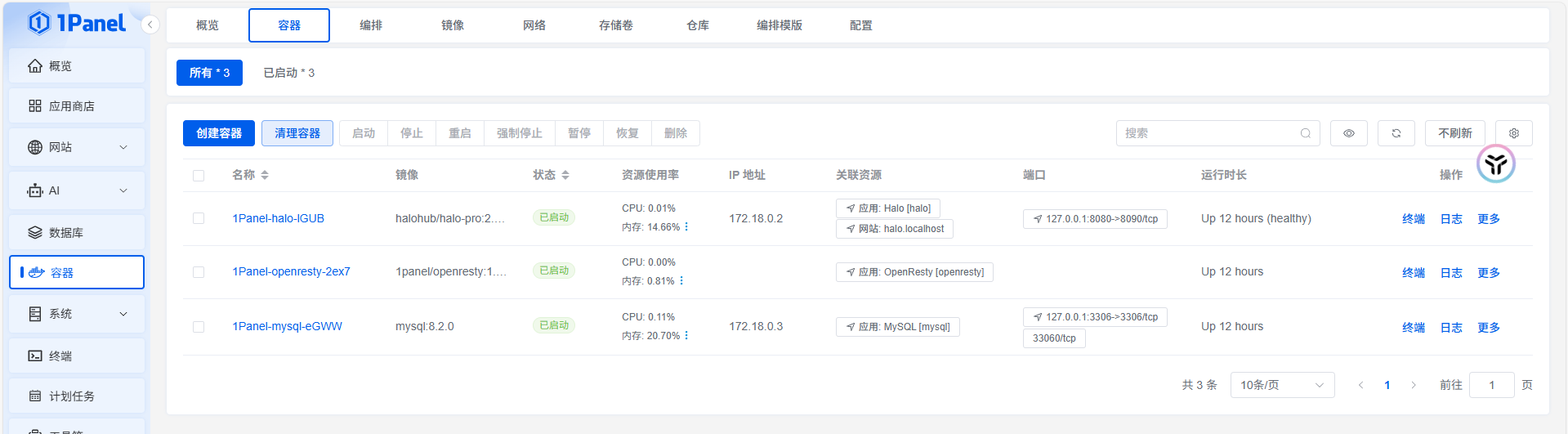 通过这两张截图可以看到,Halo网站是通过1Panel服务里面的容器做成一个服务容器。