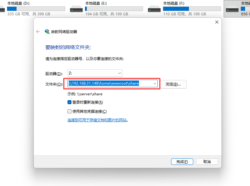 \,而不是 NFS 标准的正斜杠 /。\\192.168.31.148\home\wwwroot\share点击 “完成”。