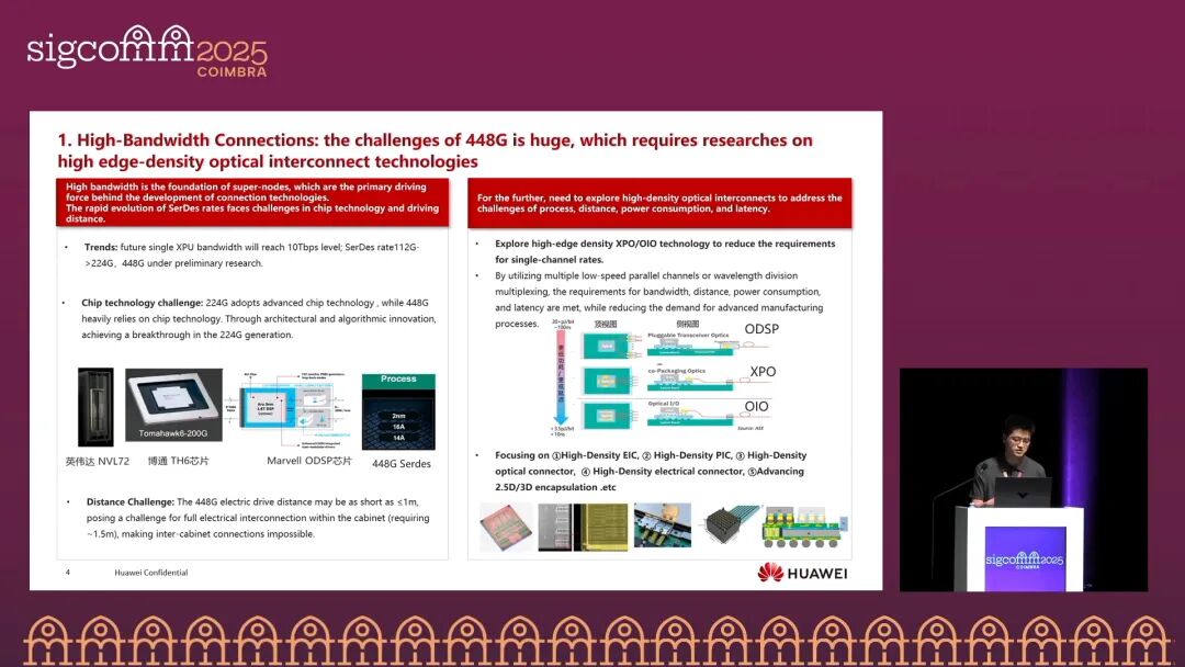 华为在演讲中明确,当前重点研究的六大挑战包括:高带宽连接、高容量交换、大规模网络拓扑(Large-Scale Fabric)、高吞吐量传输、短路径数据移动(计算架构视角)、长距离连接。