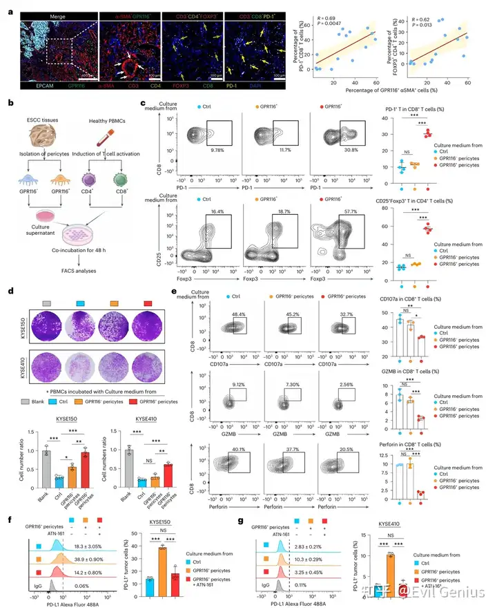 研究表明,GPR116+周细胞在肿瘤微环境中发挥关键免疫抑制作用。单细胞RNA测序分析显示,GPR116+周细胞与耗竭性CD8+ T细胞及调节性T细胞(Treg)呈显著正相关。多重免疫荧光染色证实,PD-1+CD8+ T细胞和Treg细胞在GPR116+周细胞周围富集,且在转移性ESCC患者中更为明显。