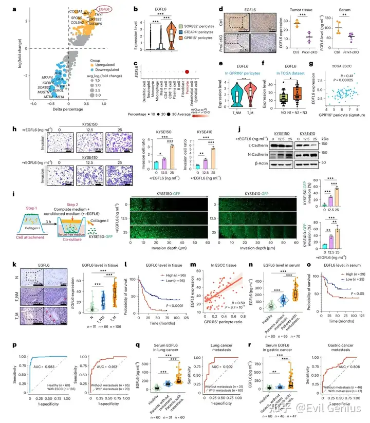 转录因子PRRX1驱动生成的GPR116+周细胞是促进食管鳞癌(ESCC)转移的关键因素。这部分细胞通过特异性高分泌蛋白EGFL6,作用于肿瘤细胞并增强其侵袭性与上皮-间质转化(EMT)进程,从而驱动转移。重要的是,分泌至血液中的EGFL6在转移患者中显著升高,不仅能高效区分癌症患者与健康人群(AUC = 0.983),还能精准预测转移发生(AUC = 0.912),且其高水平预示着更短的生存期。因此,血清EGFL6被鉴定为一个由GPR116+周细胞来源的、极具临床应用潜力的无创诊断与预后生物标志物。