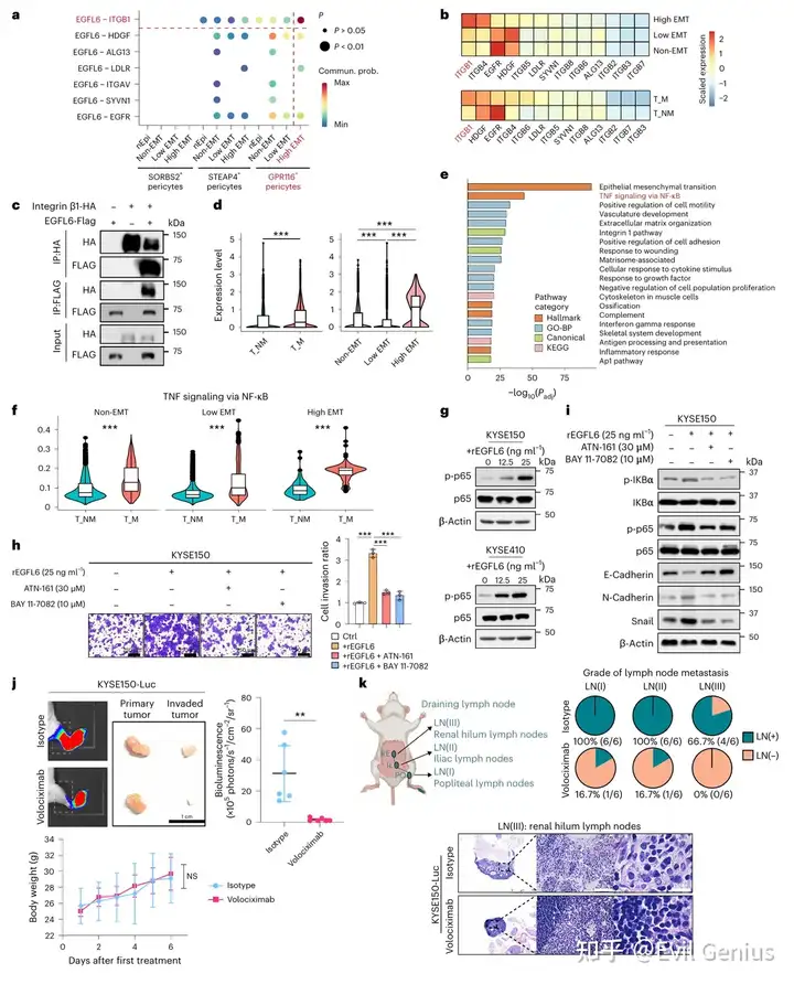 研究表明,GPR116+周细胞与高EMT肿瘤细胞之间主要通过EGFL6–整合素β1的配体-受体相互作用进行信号交流。整合素β1在高EMT肿瘤细胞中特异性高表达,且与转移密切相关。机制上,EGFL6与整合素β1结合后,能剂量依赖性地激活NF-κB信号通路(表现为p-p65水平升高),进而促进肿瘤细胞侵袭和EMT进程。使用整合素β1抑制剂(ATN-161)或NF-κB抑制剂(BAY 11-7082)均可显著阻断EGFL6的促转移作用。